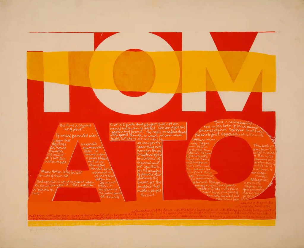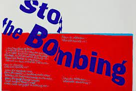 More political is stop the bombing (1967), her protest against Vietnam, with blue text against an angry red background.