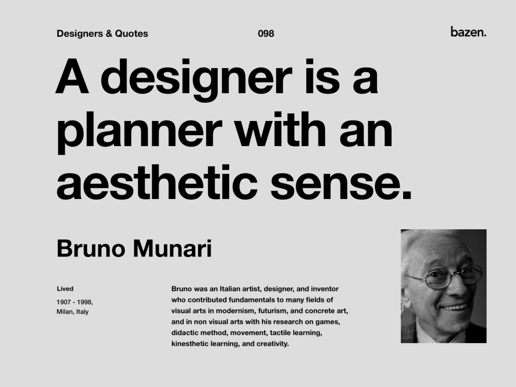 Bruno Munari (October 24, 1907 in Milan – September 30, 1998 in Milan) was an Italian artist, designer, and inventor who contributed fundamentals to many fields of visual arts (painting, sculpture, film, industrial design, graphic design) in modernism, futurism, and concrete art, and in non-visual arts (literature, poetry) with his research on games, didactic method, movement, tactile learning, kinesthetic learning, and creativity.