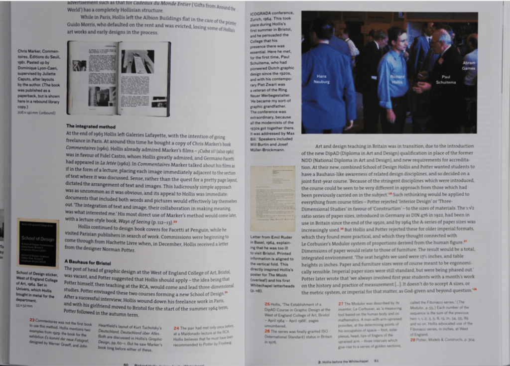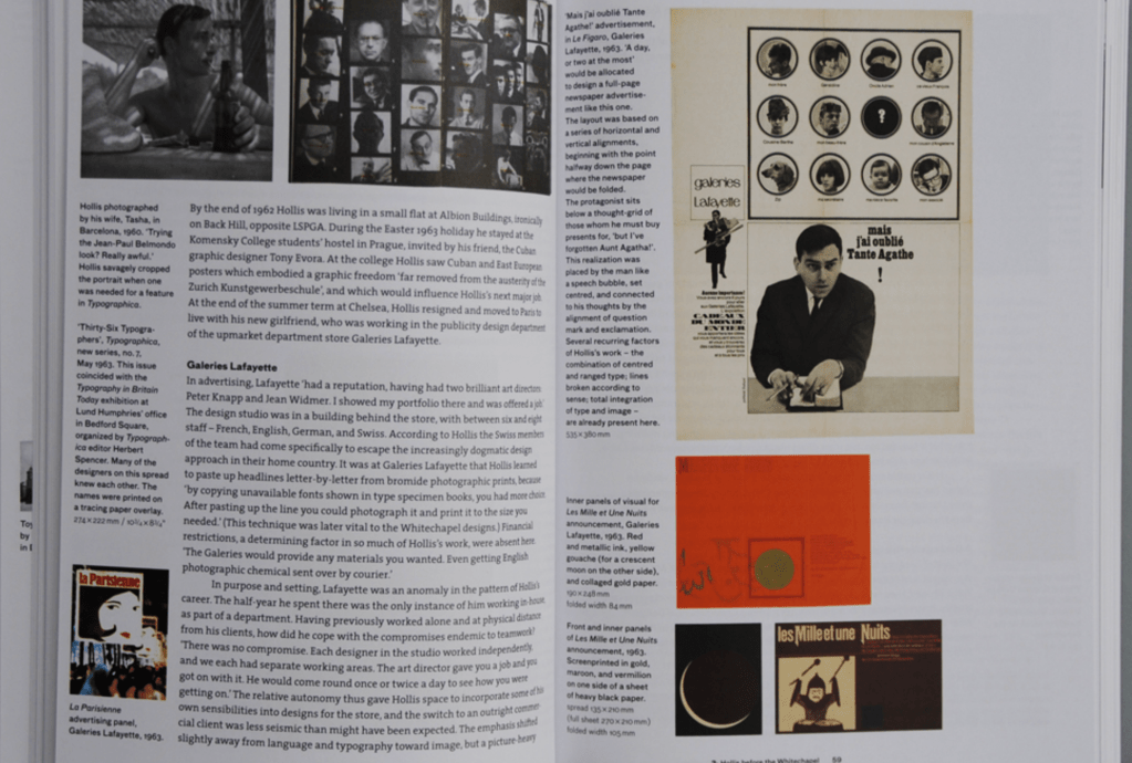 Hollis became fascinated by Swiss Modernism while the movement was still fresh and largely unknown in Britain; many of his typographic habits defy the dogma of the style’s later period. Influenced by concrete poetry, Hollis tends to break lines ‘for sense’ rather than neurotic neatness, and he has often made dynamic juxtapositions of unjustified and centred texts on the same plane.