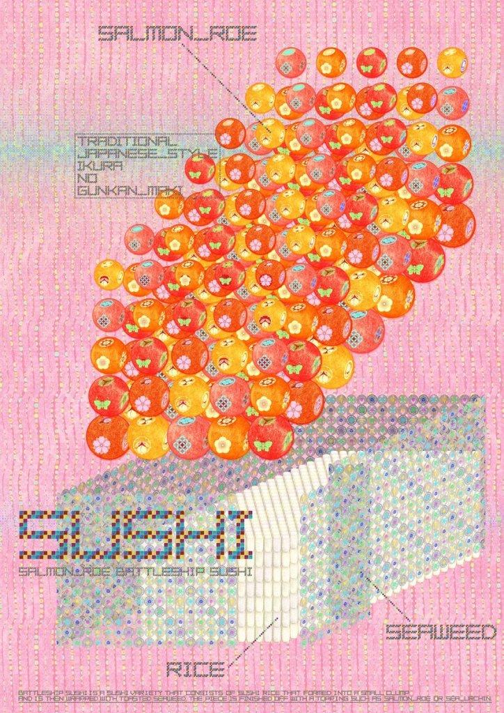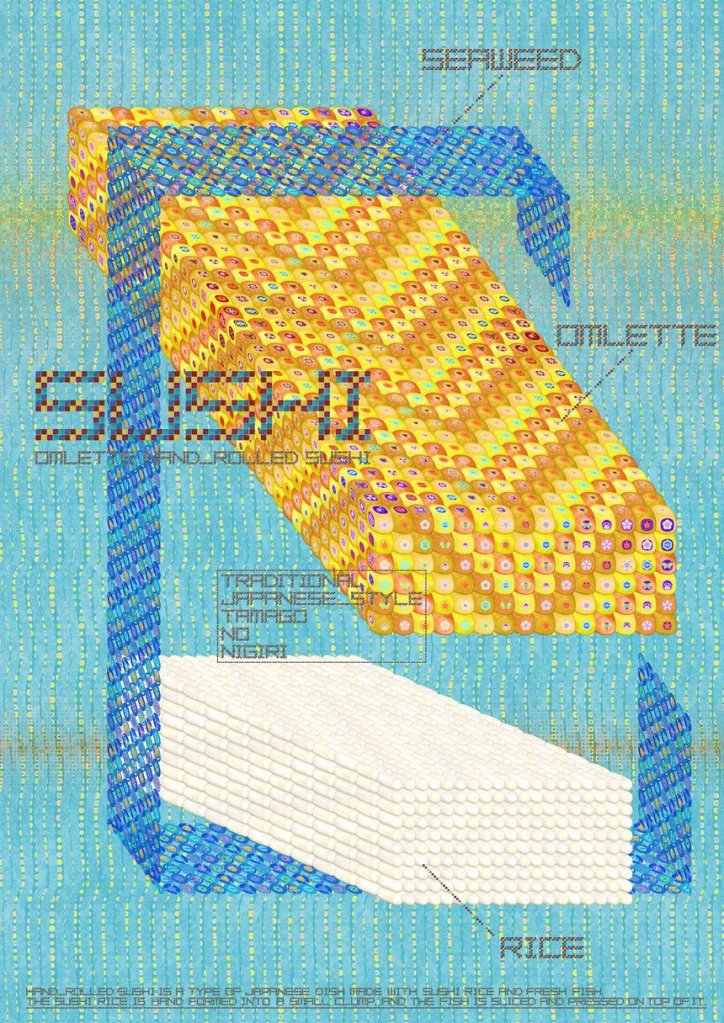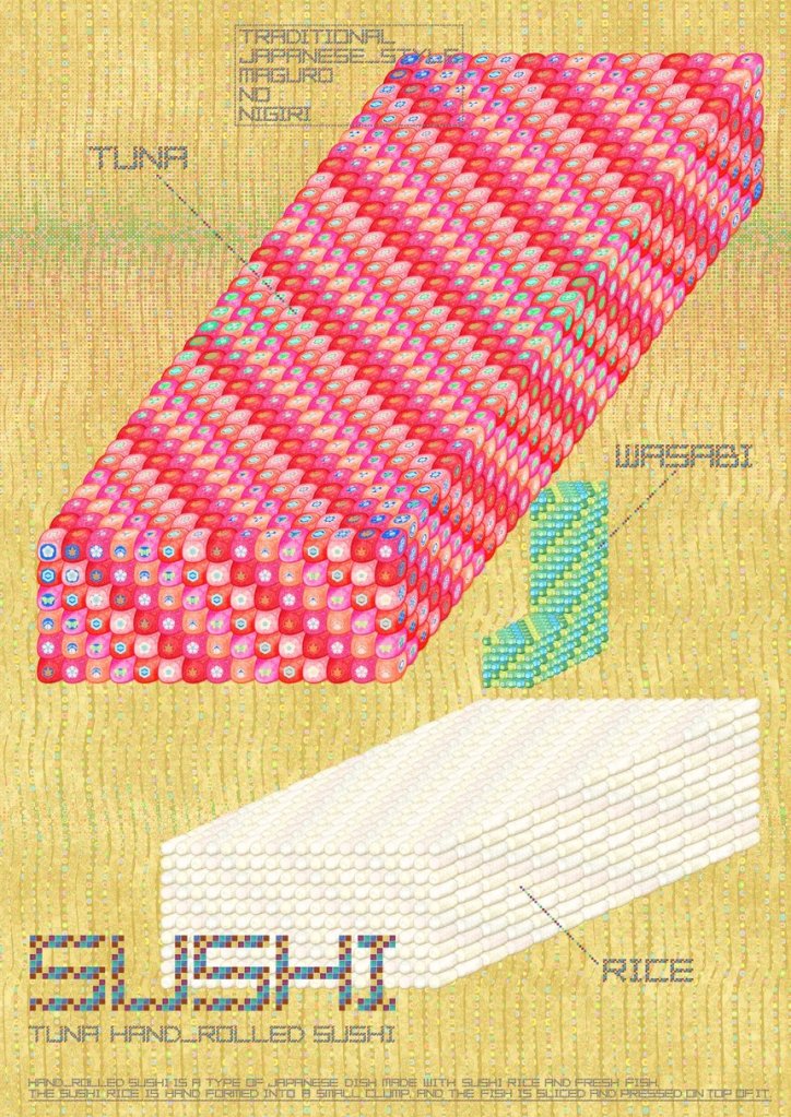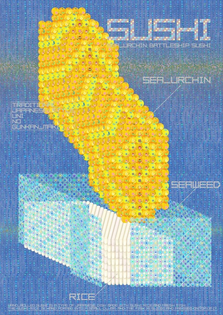 Tradition and futurism came together to give sushi an entirely new look. Every object on the screen is broken down into cell-like particles, each of which has a traditional Japanese family crest attached to it – a visual metaphor for contemporary Japanese society.