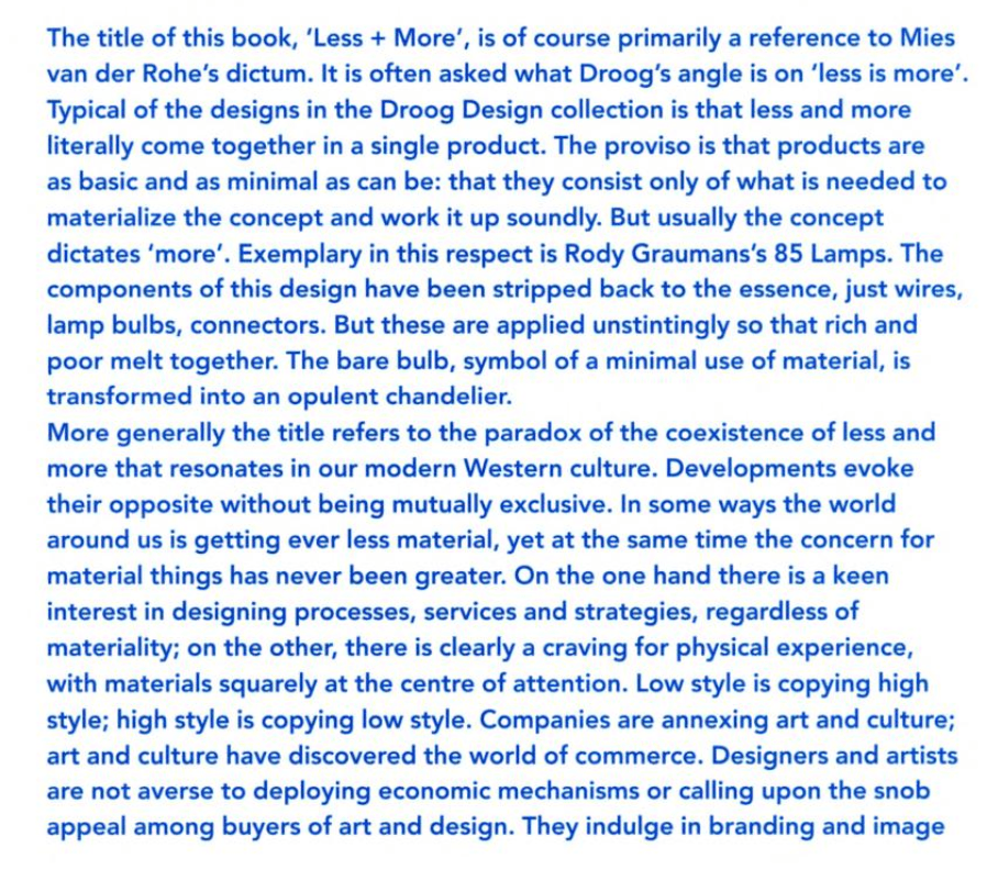 The title of the book ‘Less is more” refers to the paradox of the coexistence of less and more that resonates in our Western culture. Developments evoke their opposite without mutually exclusive.