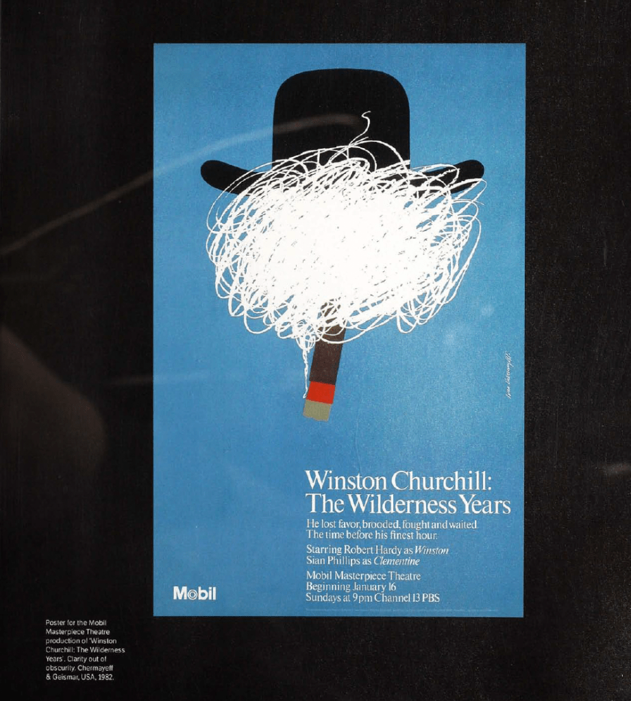Creating the poster for Churchill – “I started with some very straightforward images, and tried to make other connections. When I think of Churchill I think of brandy, cigars, the Homburg hat, the boiler suit, the summer hat, the funny pictures and the easel…The final connection is to the cigar, of being obscured by smoke.