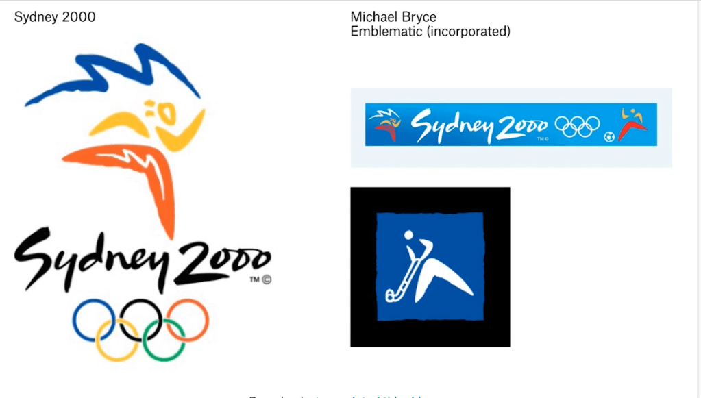 This is by Michael Bryce for the Sydney Olympics where this emblematic approach is much more grabbing lots of things. You can see a boomerang here, a person made out of a boomerang, and the Sydney Opera House; the person is drawing the Sydney Opera House. There’s this illustrative feeling that’s used to suggest things about Sydney. Then the typography, this script-based typography, it still feels incorporated, it still feels like one thing but it’s very emblematic, it’s very suggestive of what the country is supposed to be.
