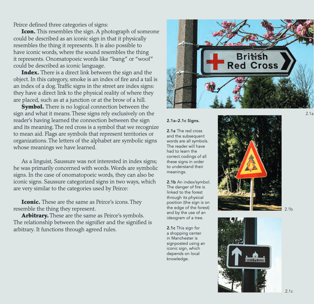 Furthermore, signs can be ordered into three further categories: icon, index and symbol.