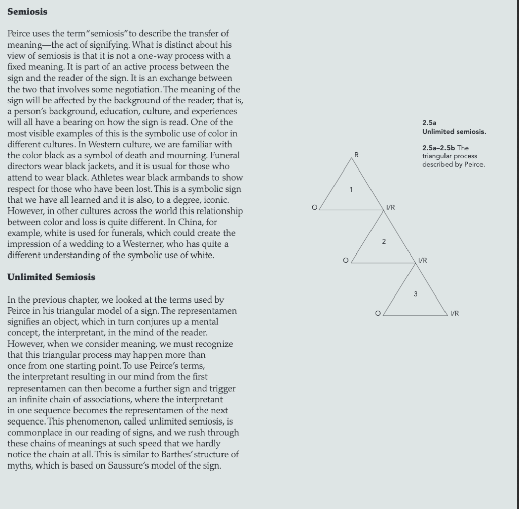 Peirce uses the term “semiosis” to describe the transfer of meaning—the act of signifying. What is distinct about his view of semiosis is that it is not a one-way process with a fixed meaning. It is part of an active process between the sign and the reader of the sign. It is an exchange between the two that involves some negotiation. The meaning of the sign will be affected by the background of the reader; that is, a person’s background, education, culture, and experiences will all have a bearing on how the sign is read. One of the most visible examples of this is the symbolic use of color in different cultures. In Western culture, we are familiar with the color black as a symbol of death and mourning. Funeral directors wear black jackets, and it is usual for those who attend to wear black. Athletes wear black armbands to show respect for those who have been lost. This is a symbolic sign that we have all learned and it is also, to a degree, iconic. However, in other cultures across the world this relationship between color and loss is quite different. In China, for example, white is used for funerals, which could create the impression of a wedding to a Westerner, who has quite a different understanding of the symbolic use of white.