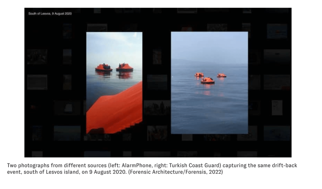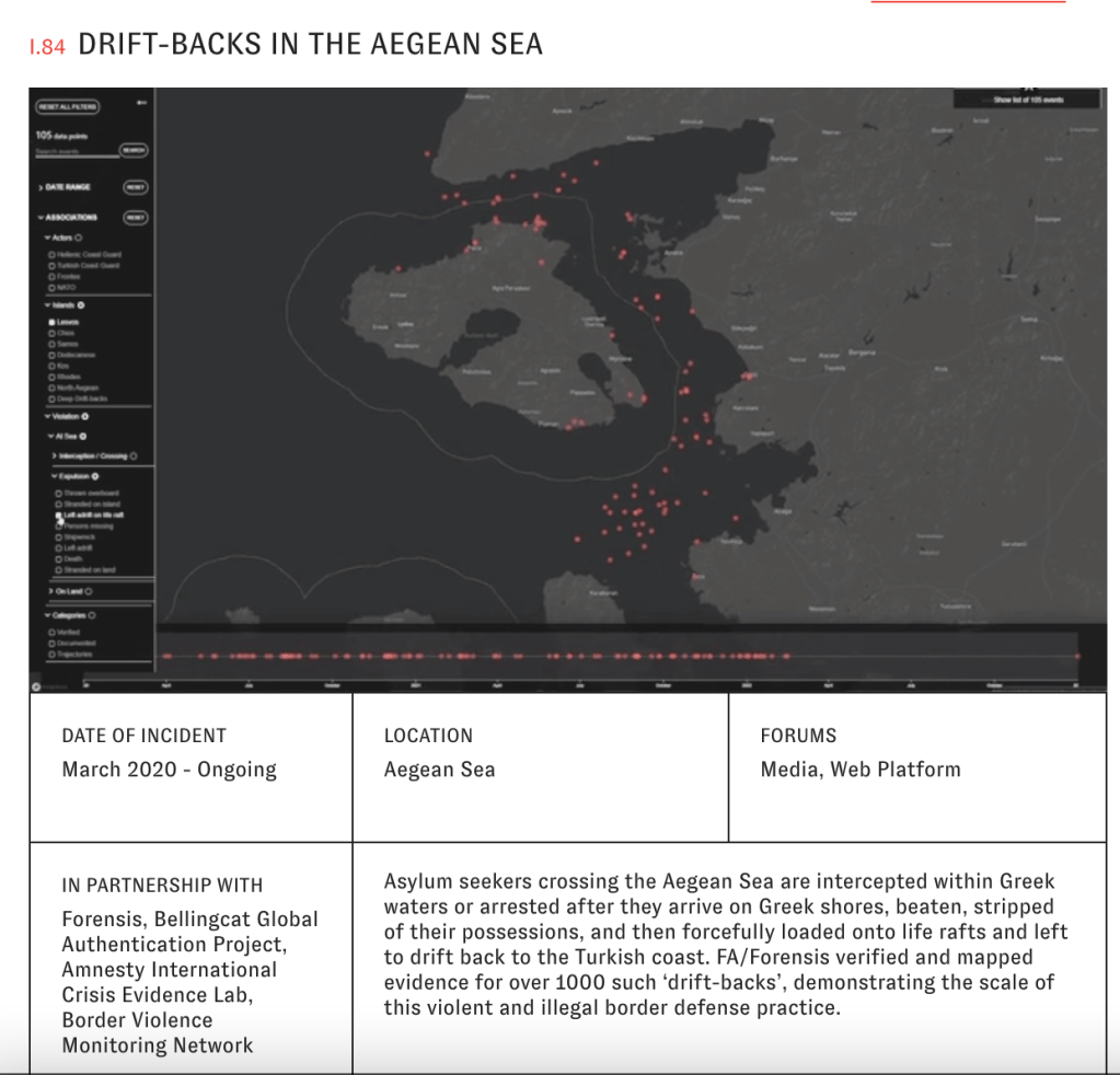Spanning a period of two years, from 28 February 2020, when the first drift-back case was reported and documented, to 28 February 2022, this interactive cartographic platform hosts evidence of 1,018 drift-backs in the Aegean Sea, involving 27,464 people. Of these 1,018 incidents, 386 were found to have taken place from or off the shores of the island of Lesvos, 126 off Chios, 194 off Samos, 120 off Kos, 89 off Rhodes and 86 in the rest of the Dodecanese. Sixteen deep ‘drift-backs’ were recorded, meaning that asylum seekers were intercepted deep inside Greek waters before being taken to the border and left adrift. One case was recorded in the North Aegean, off the island of Samothraki. FRONTEX, the European border and coast guard agency, was found to have been directly involved in 122 of these cases, while it is understood to have knowledge of 417, having logged them in its own operational archives, codified and masked as ‘preventions of entry’. In three cases, the German NATO warship FGS Berlin was present on the scene. (https://forensic-architecture.org/investigation/drift-backs-in-the-aegean-sea)