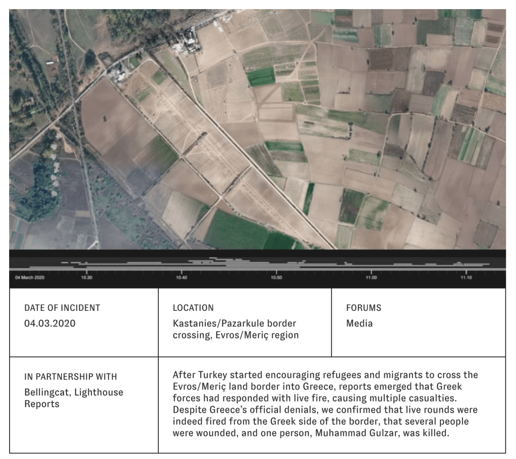On the next day, 4 March, violence escalated near the border crossing. Reports emerged of shootings, and casualties. Turkish authorities stated that the Greeks “used live rounds and wounded five asylum-seekers.” The Greek authorities denounced these claims as fake news. There is still no commonly accepted account of what happened that day. (https://forensic-architecture.org/investigation/the-killing-of-muhammad-gulzar)