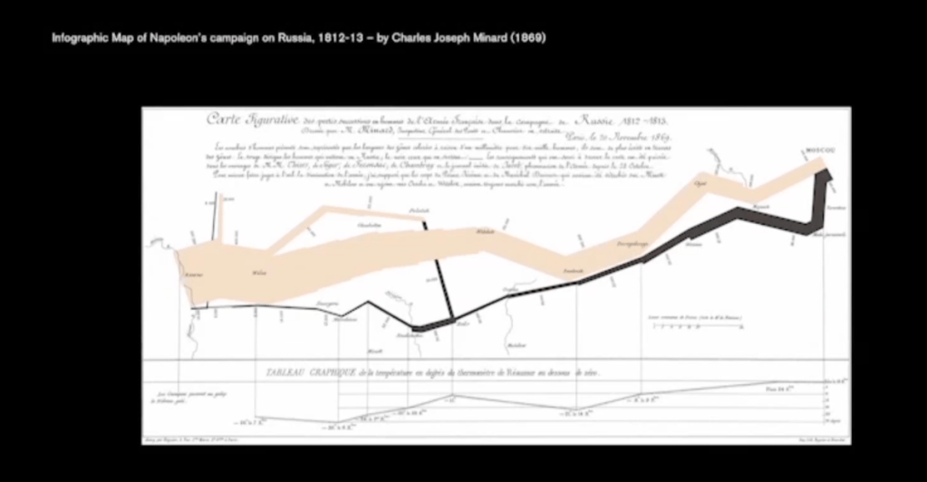 This second image was created by Charles Joseph Minard in 1858. You should already be aware of Minard, he’s a French civil engineer, recognised as the pioneer of information graphics as we’ve provided a bit of information about him in the read | watch | listen resource material, which is provided to accompany this week’s learning.
