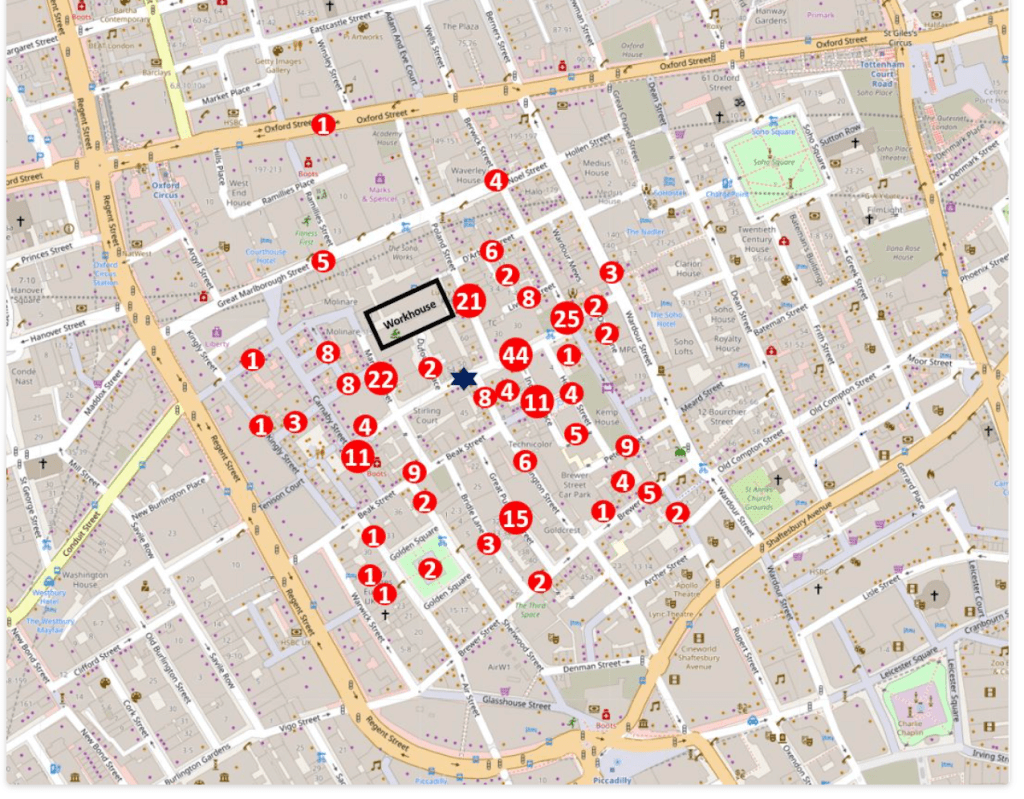 The dark blue star in the centre is the location of the pump. The numbers represent the total deaths listed for that street, so for example the number 44 to the right of the pump represents the total number of deaths in Broad Street to the left and right of the pump. There were a high number of deaths in Poland Street (21), and many of these occurred at the workhouse which is represented by the black rectangle in the above map.