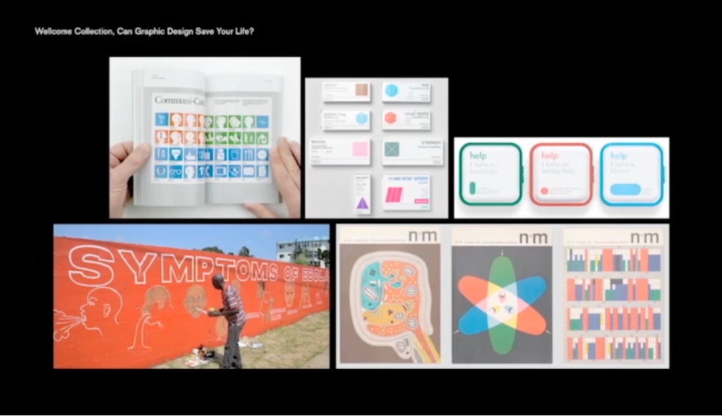 Less tasty and sometimes quite hard to swallow is the role of information graphics in health and health education. In 2017, the Wellcome Collection curated an exhibition called ‘Can Graphic Design Save your Life?’. It was a really interesting exploration into the different ways that information graphics and other forms of communication design can influence people with life-saving information, visualised in the clearest possible way. For example, this naive depiction of the different forms of the Ebola virus was painted on walls throughout Liberia, where over 30 languages are spoken. Rather than masses of text, they used the power of iconograms to highlight the key symptoms to help self diagnosis.