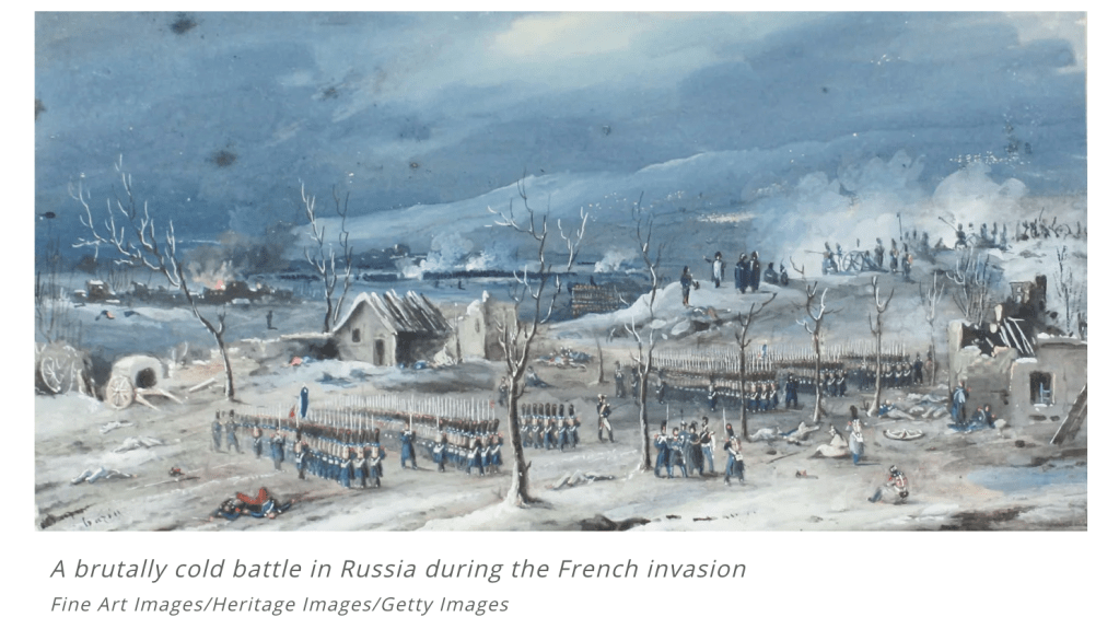 Czar Alexander of Russia sees that Napoleon was becoming too powerful, so he refuses to participate in this embargo. Angry at Czar Alexander’s decision, Napoleon gathers a massive army of over 400,000 to attack Russia in June of the year 1812. While Russia’s troops are not as numerous as France’s, Russia has a plan. Russian troops keep retreating as Napoleon’s troops move forward, burning everything they pass, ensuring that the French forces could not take anything from their environment. Eventually the French army follows the Russian army all the way to Moscow during October, suffering major losses from lack of food. By the time Napoleon gets to Moscow, he knows he has to retreat. As winter settles into Europe and the temperature drops, Napoleon’s troops suffer even more losses, returning to France from lack of food, disease, and weather conditions.”