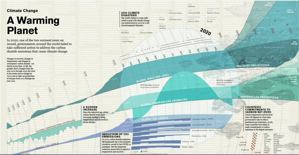 Climate change is the focus of the other visualization, “A Warming Planet,” which is presented as a flowing linear timeline. The section representing 2020–one of the warmest years on record–has been enlarged as though under a magnifying glass, zooming in on the effects of environmental disasters such as wildfires and hurricanes, as well as the reduction of carbon dioxide emissions due to the economic slowdown caused by the Covid-19 pandemic. Looking forward, the timeline projects rising temperatures and sea levels through 2100 and beyond.