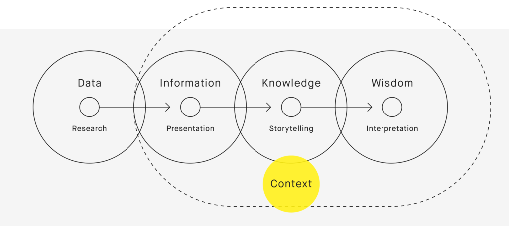 The concept of the project is inspired by Nathan Shedroff’s interpretation of the DIKW hierarchy where knowledge of a subject’s context is key in understanding and conveying it.