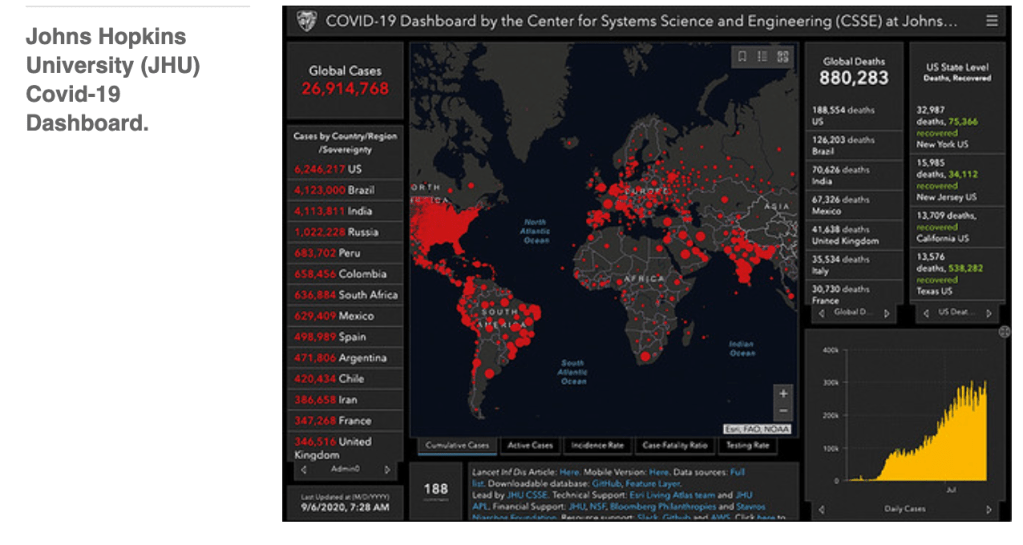 he dashboard, built from the Esri ArcGIS toolkit, combines numbers in bold contrasting colours with a bubble map. Its most striking visual comes from the red dots that represent cumulative reported cases on a black or grey geographic outline. The global focus results in a visualisation as uneven as the data that drives it. The dot number varies per country, representing the absence or availability of national, provincial or local data. The impression is of a world covered in red wounds. The user can pan and zoom into parts of the map to reveal additional detail.