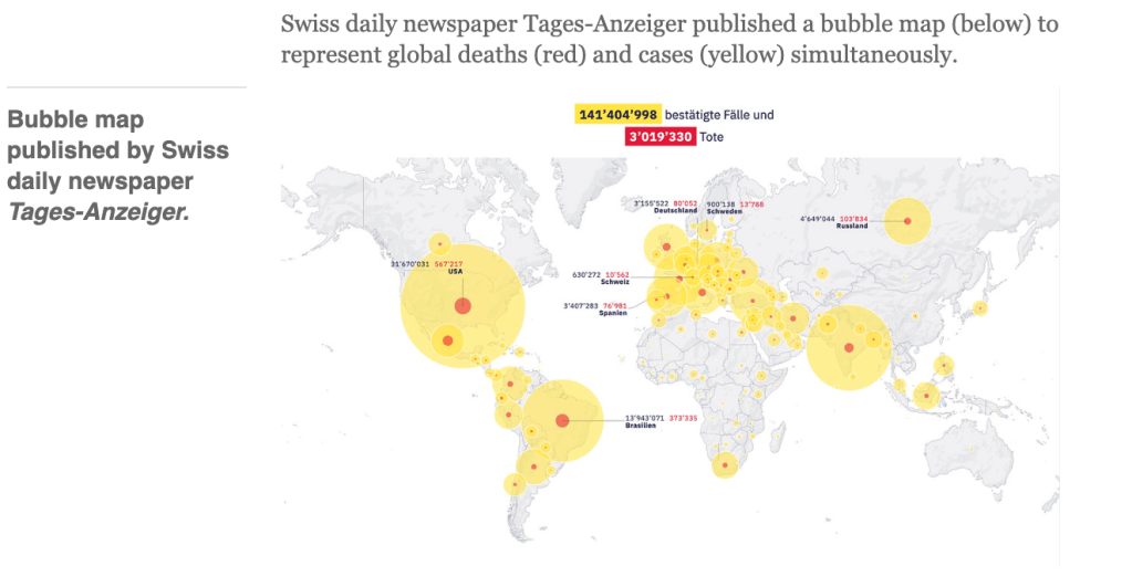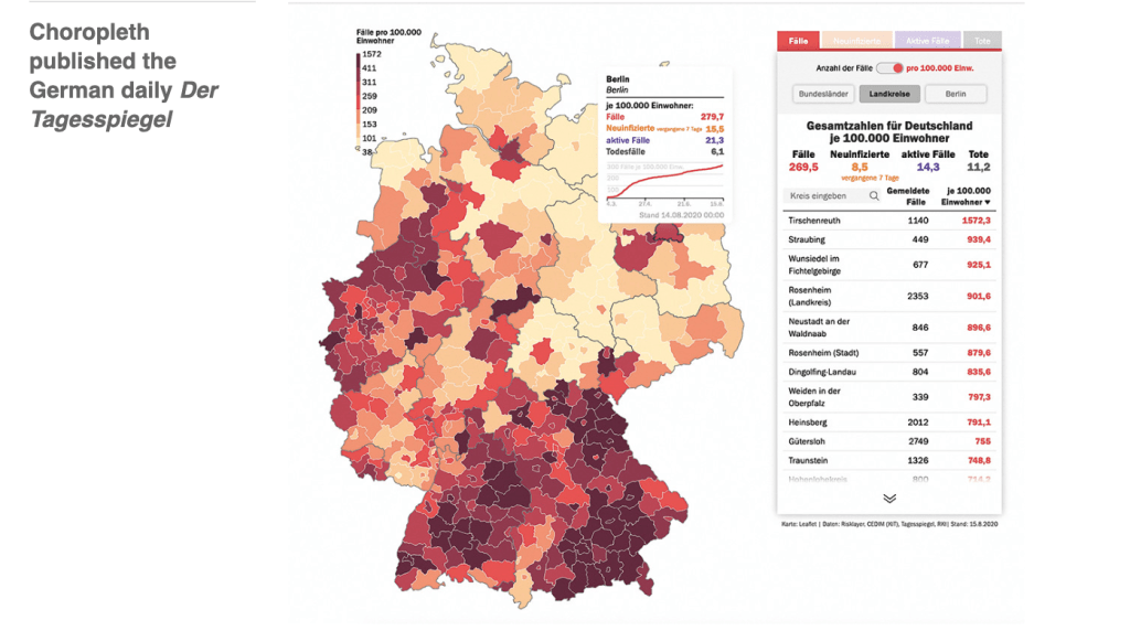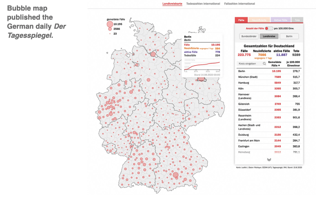 Online visualisations can place the advantage and disadvantage of choropleth and bubble maps in the hands of the reader, as seen in the German daily Der Tagesspiegel (below). The display for total cases (‘Anzahl der Fälle’) is a map with a range of three bubble sizes. To show cases per 100k population the visualisation switches to a choropleth display with six shades from light to dark encoding quantities. The density of cases in the south is more visible in the choropleth, while the distribution of cases is clearer in the bubbles.