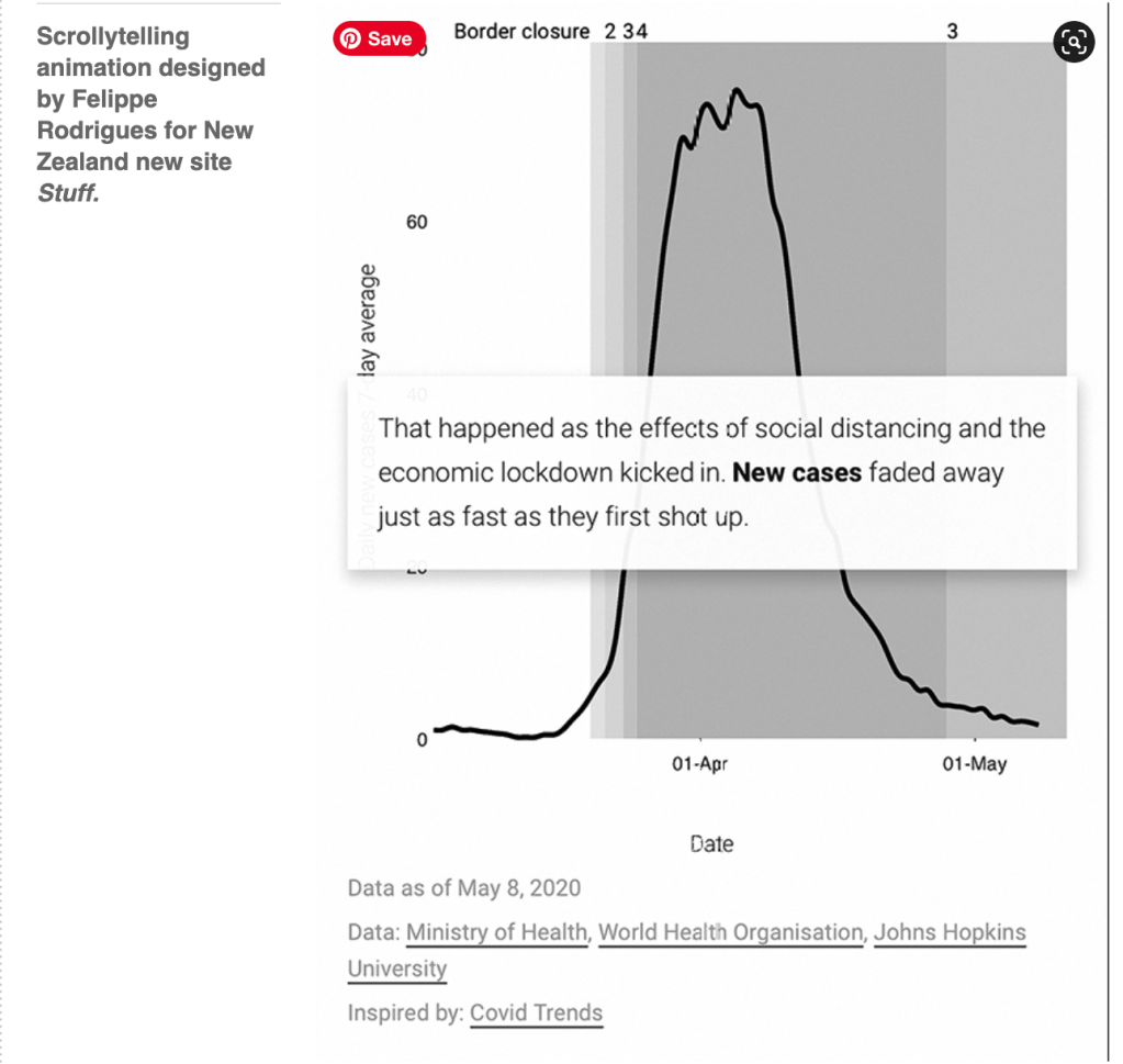 A piece written and designed by Felippe Rodrigues for the New Zealand news site Stuff, created in early May 2020 when that country managed to stop its infection rate, uses curves and permutations in line graphs to explain and compare the health situation in various countries (below). In an interview in Storybench, Rodrigues describes the ‘scrollytelling’ animation technique. Scrolling through the page focuses the reader on NZ data as he changes from a logarithmic scale for the number of cases (which displays flattening when the rate of infections decrease) to a linear scale that shows the moment when the number of falling active cases crossed the rising number of recoveries, producing a bell shape as the numbers decrease following a peak.