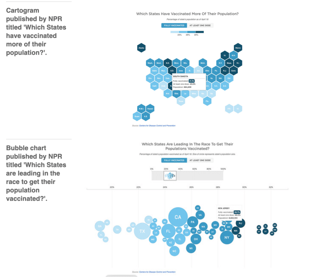 Using a cartogram (below), which distorts the geography of a region to convey information, is useful for representing the states and territories of the US, whose size and population vary widely. This example from the NPR (National Public Radio) website presents the percentage of population fully and partially vaccinated with four shades of blue. Other dimensions of the same data are represented as bubble charts in the same story. Now the population (below) is visible in the bubble size. How close or far away states of the same colour are is visible by their position on the x-axis.