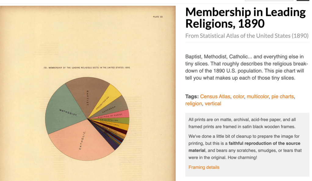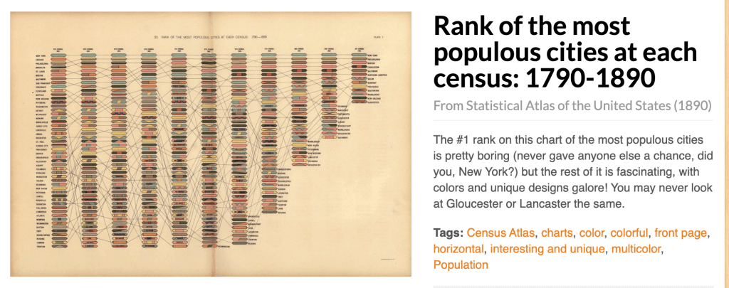 An earlier example of a well-published data visualization – created by William Playfair, largely considered to be the father of information design, in 1786 — about 100 years before Minard’s diagram was made. Playfair is the inventor of the pie chart, the bar graph, and the line graph – statistic graphics we use regularly today. This graphic has gridlines to mark the years and the number of exports.