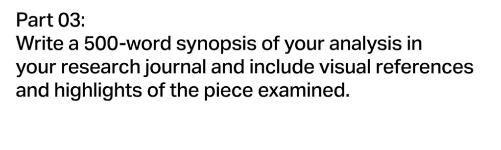 Once you have completed your analysis, we want you to write a 500-word synopsis of your research which must include visual references highlighted from your discoveries. This could be done as annotated notes or carefully edited image crops and captions to highlight your points, but whichever format you choose this is entirely up to you.