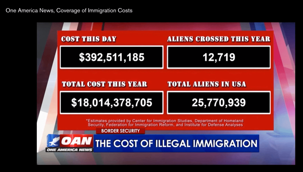 the Right wing American News network One America News pulls out complex and detailed information from a variety of sources and contextualizes them into this on-screen display of data, with no scrutiny or wider context provided.