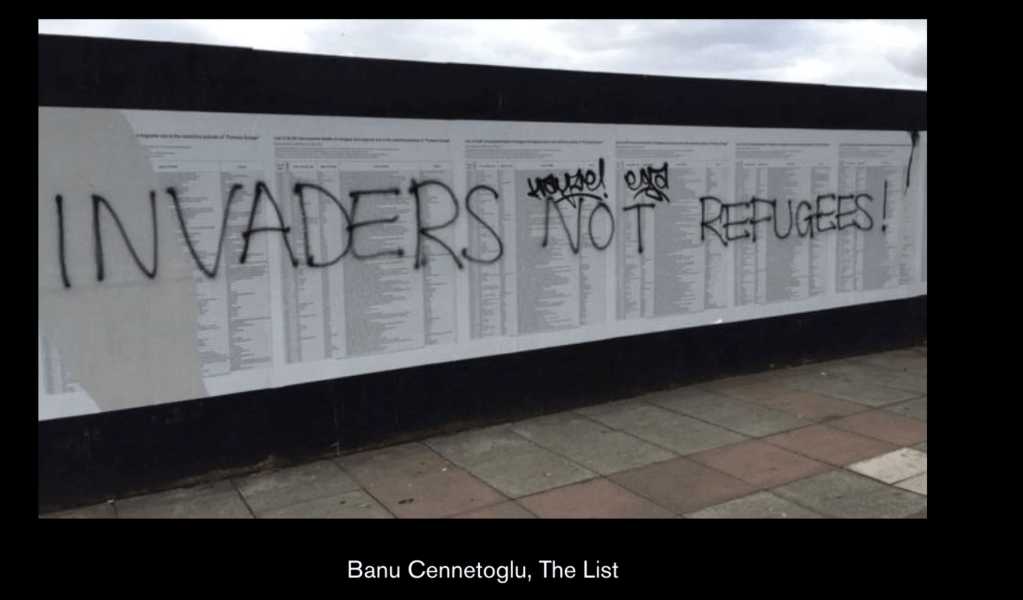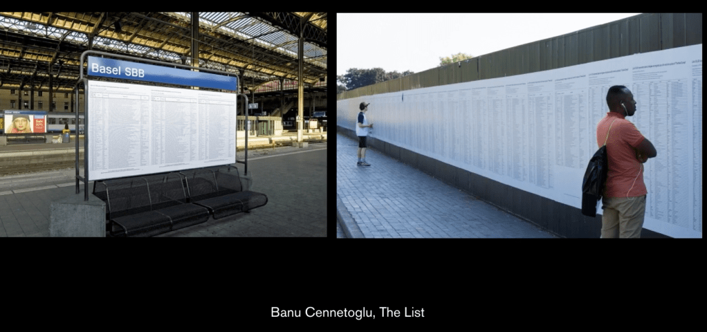 Artist Banu Cenetogluh, and her work titled The List, explores the migrant issues in an interesting way. In 2002 she discovered ‘the list’, which is a catalogue, made by volunteers, of those who had died in their attempt to make a new life in Europe. The list is one of the most powerful pieces of information design.