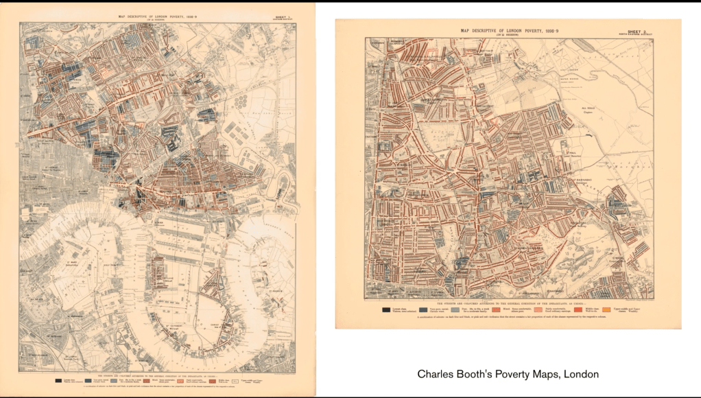 This example by English social researcher and reformer, Charles Booth, was an enquiry into life and labour in London between 1886-1903. An early example of social cartography, each street is coloured to indicate the income and social class of its inhabitants. Through direct first hand research and through detailed consultation with police records and residents, he mapped wealth and poverty throughout the streets of London.