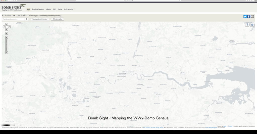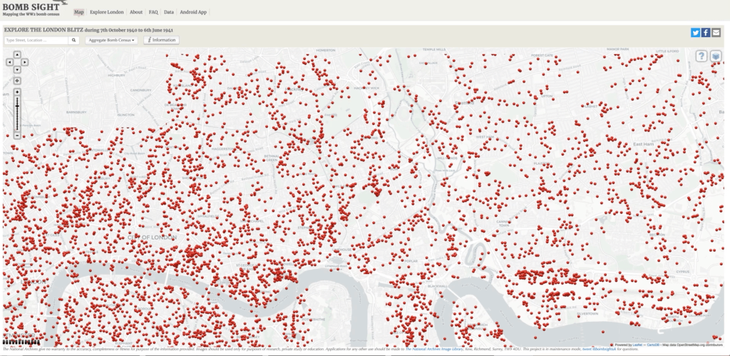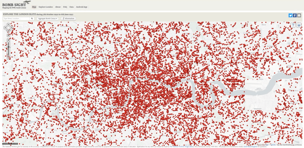 The project, called Bomb Sight, is built on data from the WW2 bomb census held in the National Archives. Organised by Dr Catherine Emma Jones, from the University of Plymouth – and working with a team of designers and developers – the project visualises bombs fallen during the Blitz in London, gathers complex data and observations, and gives it geographic and interactive form.