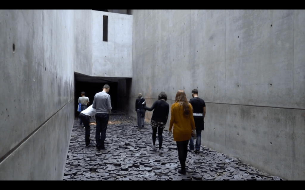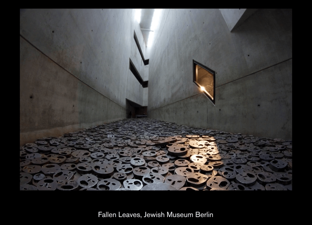 The project, called Fallen Leaves, by Artist Menashe Kashiman at the Jewish Museum in Berlin, is an interesting way of representing victims of violence and war. Rather than graphs, statistics or information displays, it asks visitors to walk over, heavy iron plates with faces cut into them, representing those that have died. The noise that the act of walking over the faces on the floor not only places the audience directly within this piece of work, it also evokes violent, clashing, memories of war and destruction.