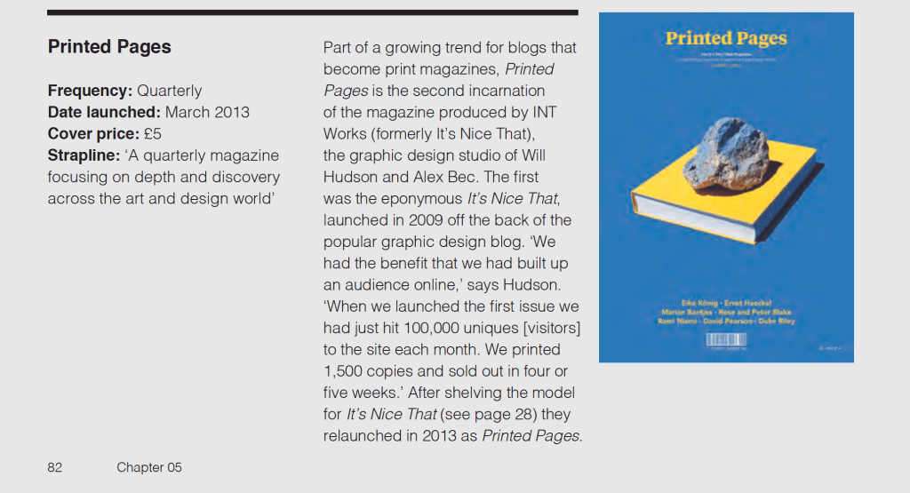And you know, the downfall, in the way, of a lot of the established publishing or print publishing worlds has created spaces for people to be really inventive. Audiences have changed in their expectations so how many people actually buy a weekend newspaper now compared with 10 years ago? People’s buying habits for magazines have got a bit more book like. You might buy three or four fairly expensive magazines a year.