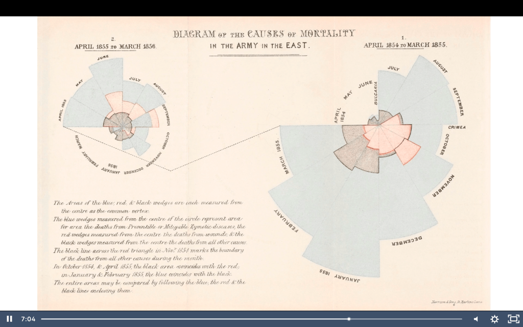 The Areas of the blue, red, & black wedges are each measured from the centre as the common vertex. The blue wedges measured from the centre of the circle represent area for area the deaths from Preventable or Mitigable Zymotic diseases, the red wedges measured from the centre the deaths from wounds, & the black wedges measured from the centre the deaths from all other causes. The black line across the red triangle in Nov. 1854 marks the boundary of the deaths from all other causes during the month. In October 1854, & April 1855, the black area coincides with the red, in January & February 1856, the blue coincides with the black. The entire areas may be compared by following the blue, the red, & the black lines enclosing them.”