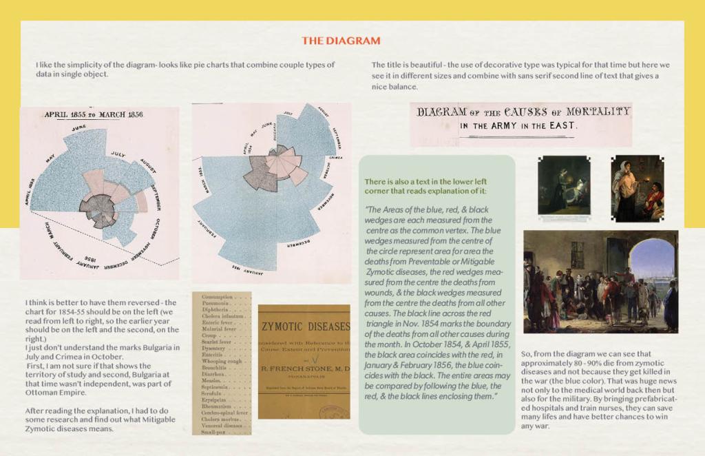 Florence Nightingale was an English social reformer, statistician and the founder of modern nursing. On 21 October 1854, Florence Nightingale and the staff of 38 women volunteer nurses that she trained were sent to the British camp in Scutari. After she arrived, she had to deal with many obstacles – short supply of medicines, neglected hygiene, no equipments to process food for the patients, and many infections that were fatal most of the time. The poor care of the soldiers was a reason for high death rate. That encourage Florence to do something about it. Her first step was to contact the leaders in England and ask for help. This was done mostly by collecting money from donations. Meanwhile, she was putting her mathematical skills in use by trying to simplify all the data that she was gathering about the reasons of death around. That’s how she came up with the diagram about the mortality of war, witch had historical significance not only in the medical field but also in the statistics and design world.