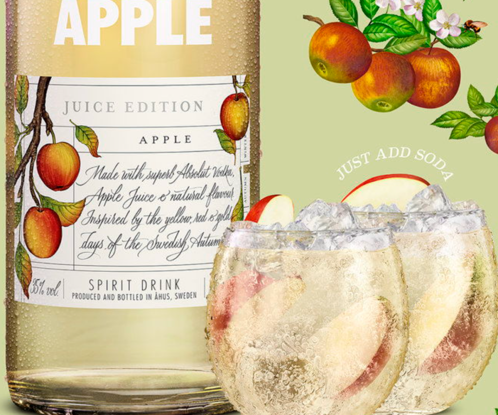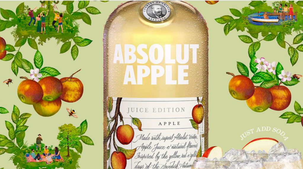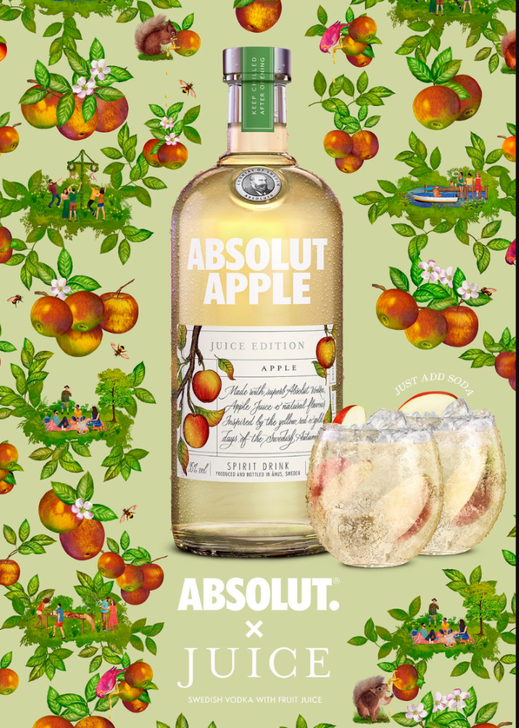 “Made with superb Absolut vodka, Apple juice, natural flavor. Inspired by the yellow, red and gold days of the Swedish Autumn.”