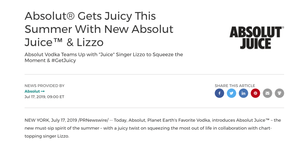 NEW YORK, July 17, 2019 /PRNewswire/ — Today, Absolut, Planet Earth’s Favorite Vodka, introduces Absolut Juice™ – the new must-sip spirit of the summer – with a juicy twist on squeezing the most out of life in collaboration with chart-topping singer Lizzo.