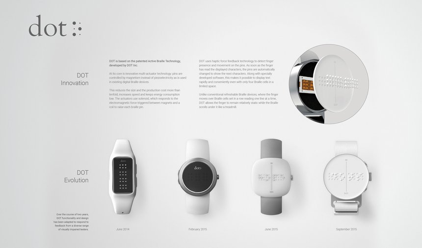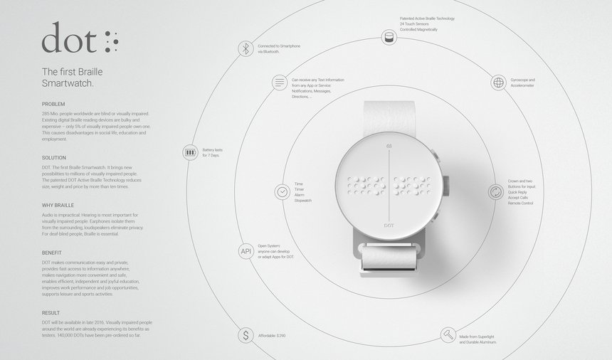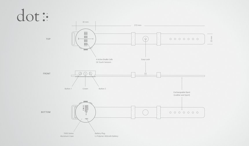 Dot Watch is a great example how we can use the features of technology to do more – to help the community and help specific group of people that most of thee time are being ignored. Blind people often rely on human agents, in person or remote through cameras, to tell them what they are looking at and interacting with or to read things to them. Unlike other smartwatches for the blind which focus on audio communication, the Dot uses a responsive braille interface created by magnetically controlled pegs or “dots” that raise and lower to form new characters with each pass.