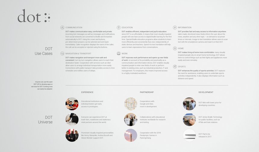 So, the blind people using this device can get the date and time or any notifications and messages send to them, without activating audible message tot talking to a device. When they use the combination of braille-enabled tablet and the Dot smartwatch, they can adjust the settings and have complete control of what can come through and what not. They can set calendar, put events or anything else on it and have reminders for each thing. This is great innovation for the blind community. Especially for the ones that need to stay successful in the business world and keep up with the rest of the coworkers. The outcome was practical and affordable solution for the blind or visually impaired people.