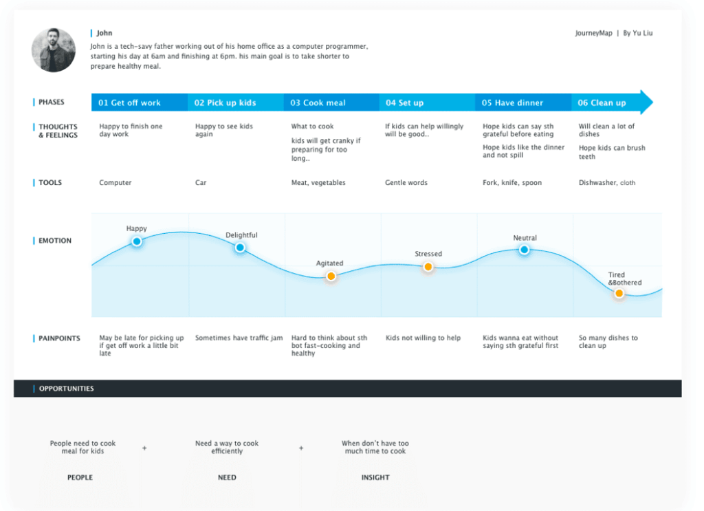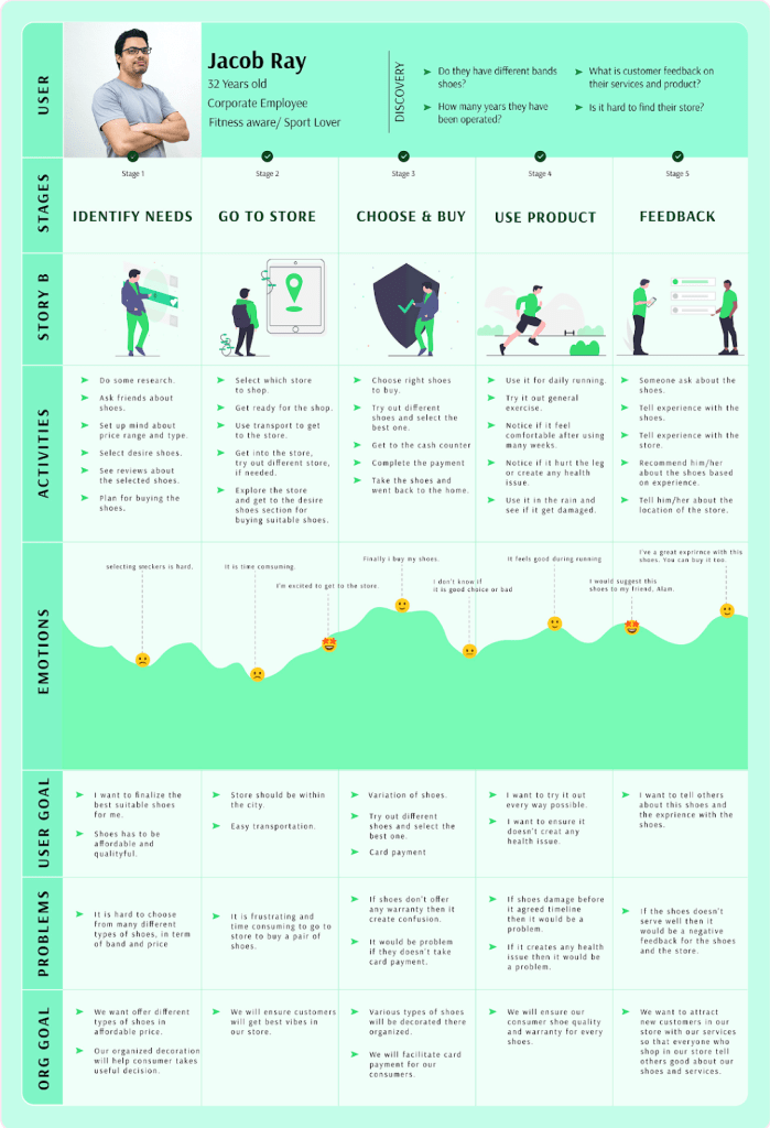 “The customer journey map divides the process of buying into clear stages that include buyer’s activities, emotions, problems, user and organizational goals, etc. All the information is clear and easy to read, the graph shows top and down moments of the journey.”