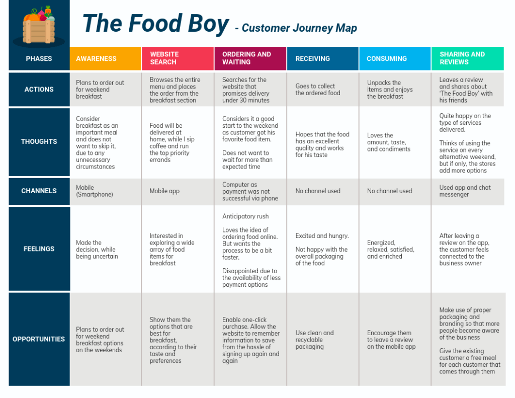 Opportunities and insights are also identified at every step of the journey. Since restaurants thrive on user reviews, sharing customer feedback and reviews online is a major phase of the customer mapping process.