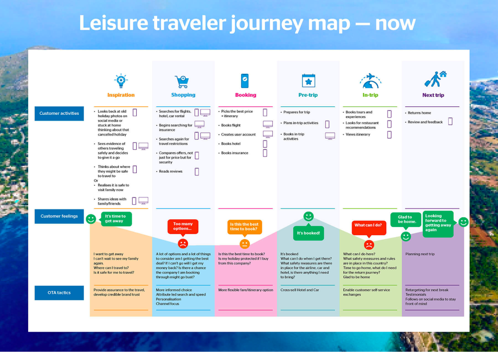 Illustrates the customer’s journey as an engaging story and pointing to the factors influencing the user’s experience.