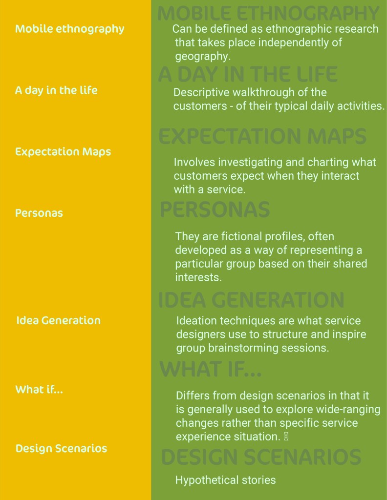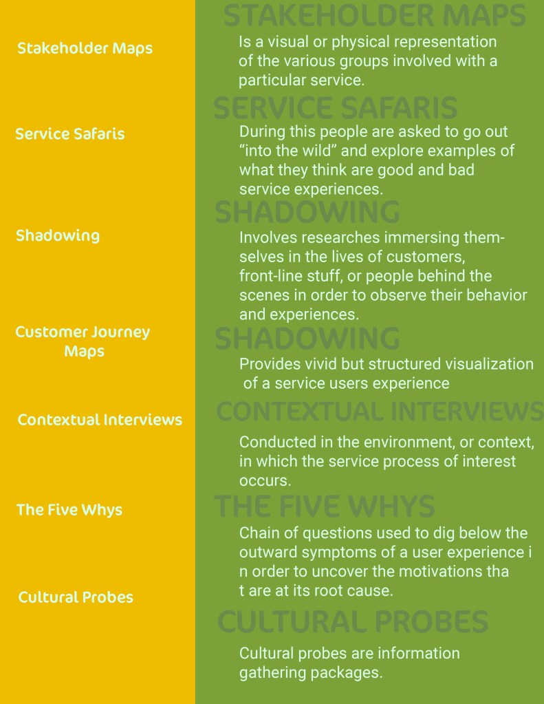 In this option, people go out and explore different examples of good or bad service experiences. So, in this method you get to know service from a customer experience perspective.