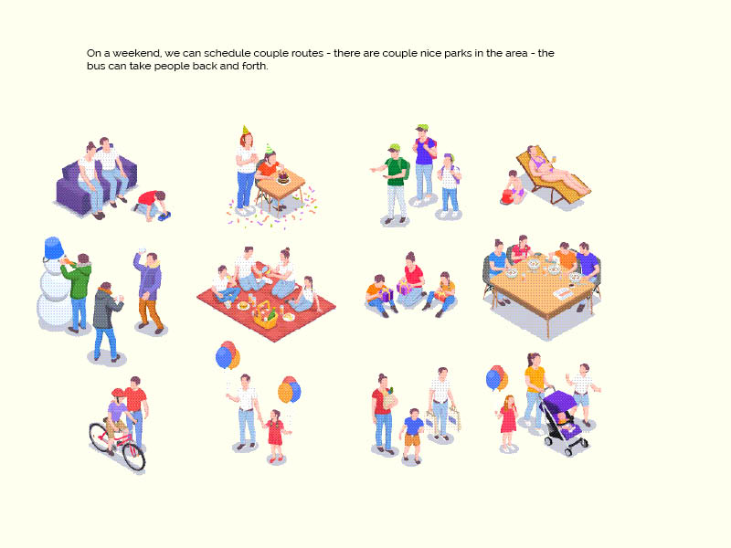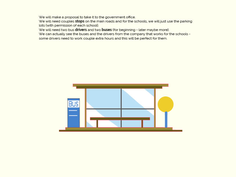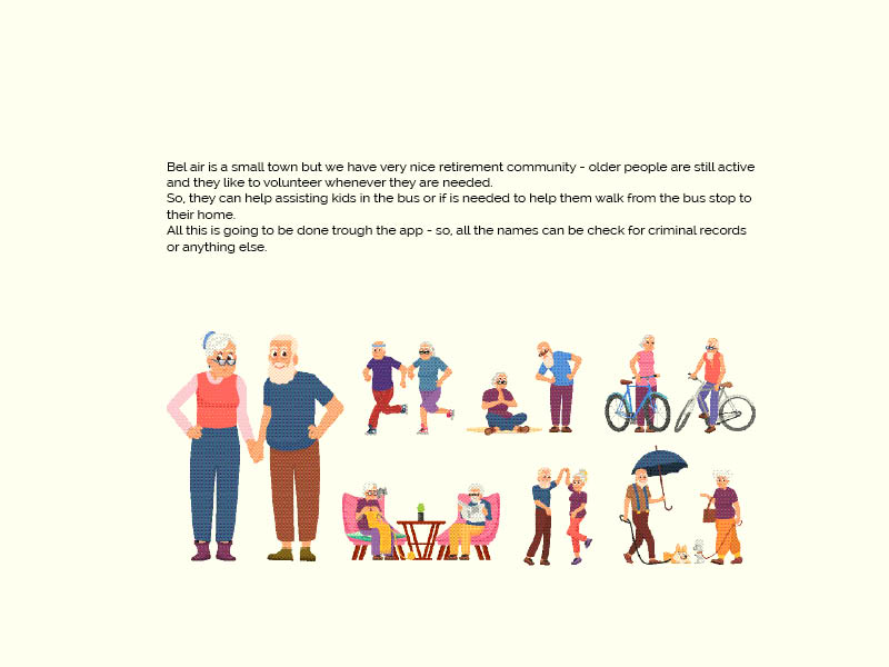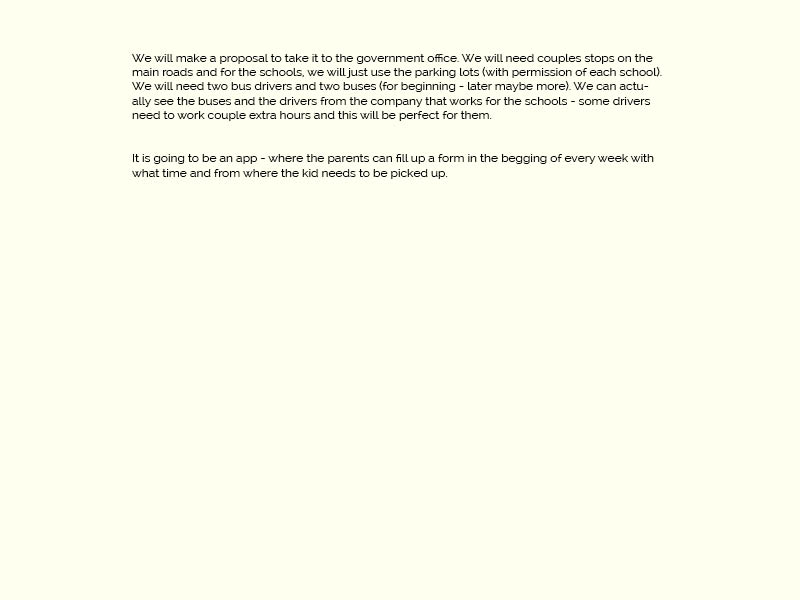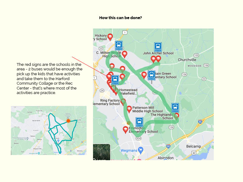 - we will use bus stops (placed on the bigger roads only – this way the bus will have less stops- parents or volunteers may walk the kids to their homes – is going to be sign up sheet for who need assistance walking, background check and confirmation)