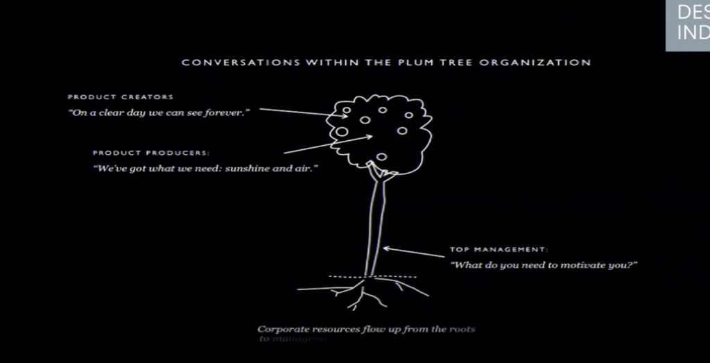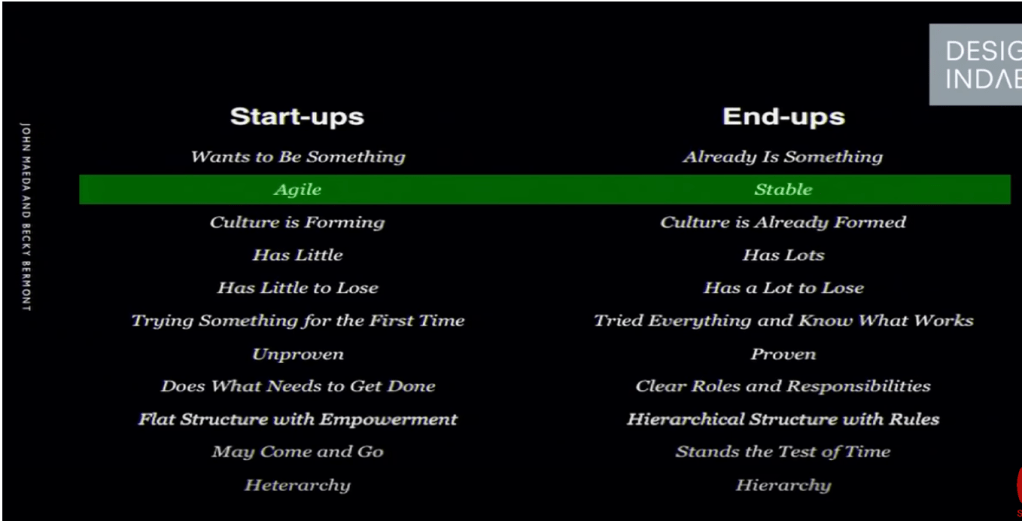 Why would you try to do anything hard in a world where doing what is easier is better and more cost-efficient? When you think of people who are being creative, I don’t think they are trying to do it the hard way; they’re trying to do it the right way. And the right way has integrity, and integrity leads to great discovery, he explains. He tells of a book Orbiting the Giant Hairball that influenced his view on leadership. Author Gordon MacKenzie compares the traditional hierarchical organisation structure of a pyramid with an alternative structure in the shape of a plum tree. Unlike the pyramid where only the top leaders have a clear view of the future, the plum tree structure sees leaders supporting doers, who produce the work, like a trunk would support a tree. While a simplistic analogy, this had a significant impact on Maeda thinking around leader and organisational structures. Maeda also shows how social media and access to information have undermined traditional hierarchy, shifting it to a heterarchy. This however results in a chaotic environment and Maeda asks how we can bring design into this space to help us function more effectively. A key fact about art and design is this: The reason that you have the ability to make creative leaps is because the risk is so low. If you think about it, it poses no threat to your health and safety and as a result the creative endeavour is often marginalised. But this is also powerful because it is in these kinds of languages of expression where risk is low that I’ve seen designers and artists iterate at a very rapid rate. It is a developed skill and this ability to iterate, this ability to be agile, is becoming increasingly important.