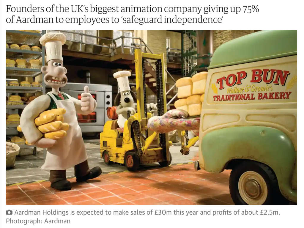 The owners of Aardman, the animation studio behind Wallace & Gromit, Shaun the Sheep and Morph, are handing over a 75% stake in the business to their 140 employees in a bid to protect the Bristol-based company’s independence…