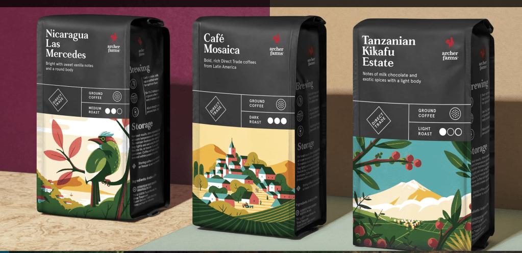 I visit often the Target stores – they sell a lot of products made by the company Anchor Farms. So, now I know the design for most of them is made by Collins.I love the colorful graphics in the coffee packages.