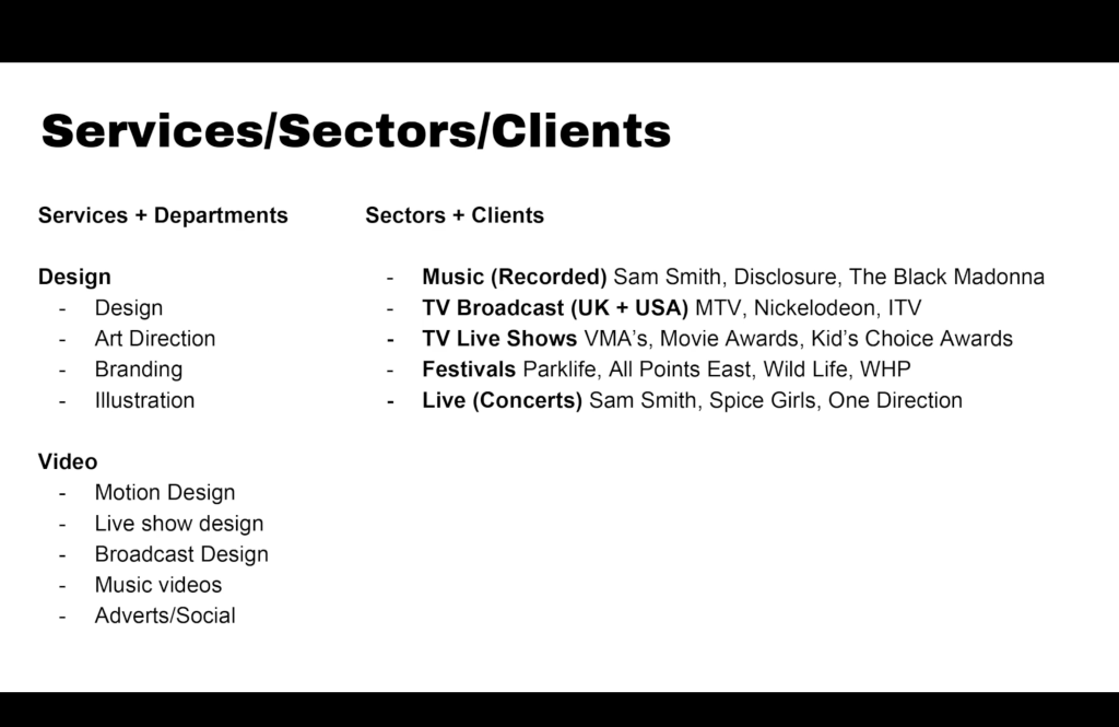 So, they have two departments – Design Department, which is design, art direction, branding and illustration, and Video Department, which is motion design, live show design, broadcast design, music videos, and social media content.