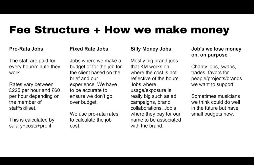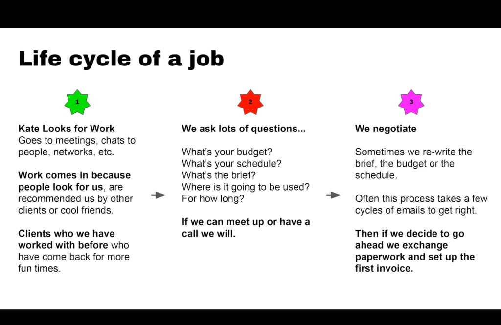 “The process after we have those jobs come in. We ask lots of questions about budget, schedule, brief, how long the work is going to be used for, where it’s going to be used? We try and dig as deep as possible and have a phone call, or a meeting if necessary. Then we negotiate. Sometimes we rewrite the brief, the budget or the schedule. This can take a few cycles between stage two and three, and then at that point we decide if we want to go ahead. Then we exchange paperwork and we set up our first invoice to be paid. “
