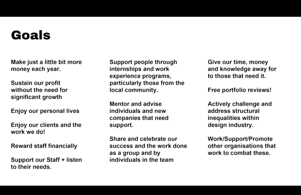 We try and make a little bit more money each year, but that is quite small, we don’t push ourselves super far to double our turnover or whatever. We try to sustain our profit without growth, so we don’t feel like we need to keep hiring in order to keep earning. Our aims are to enjoy our personal lives, enjoy our clients and the work we do, to reward our staff financially, support our staff and listen to the needs that they have, and incorporate them if needs be, into the studio and the studio systems.