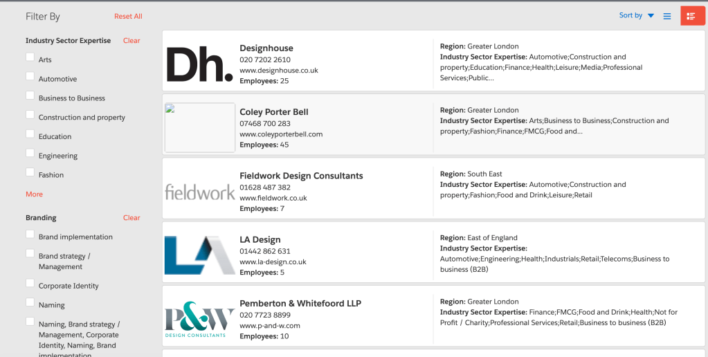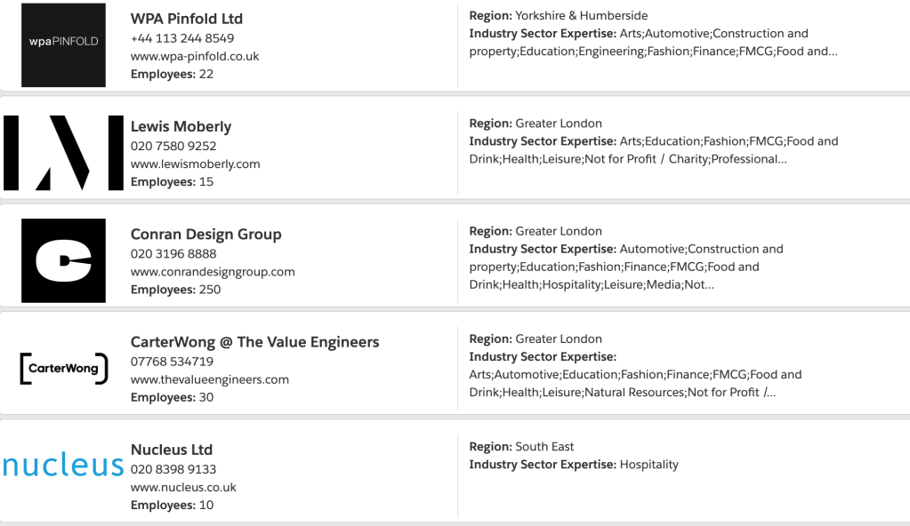 This site has information about all the creative agency in England. Has a information about how many employees they have and what is the focus of the companies.