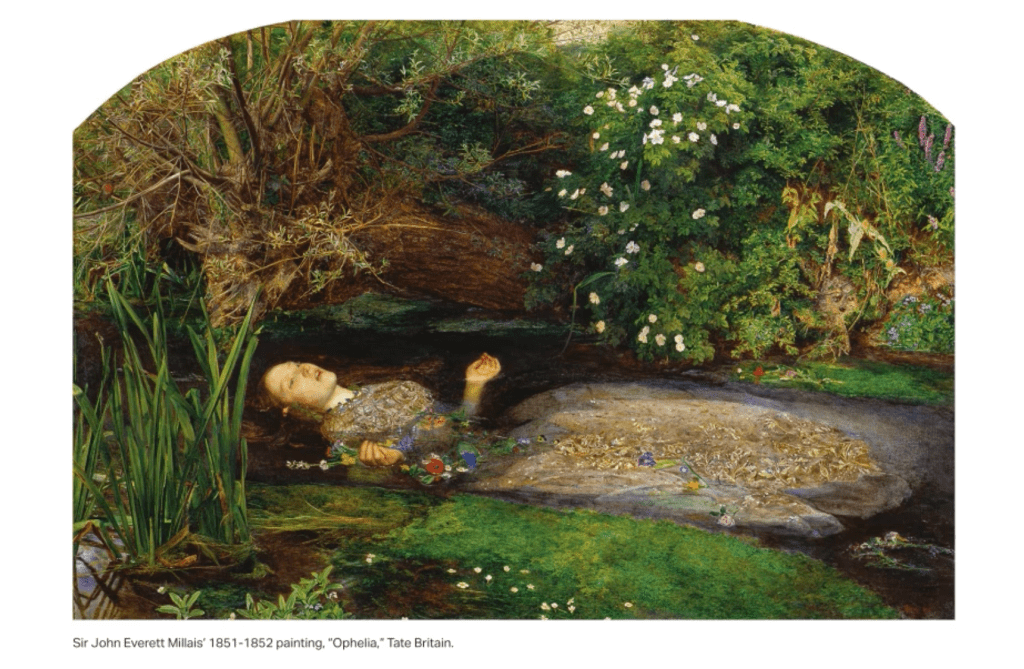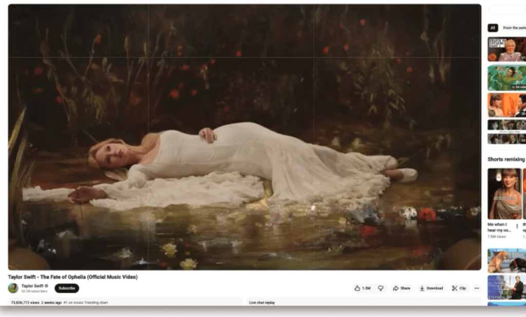 In the opening scene of the video for the hit song “The Fate of Ophelia,” Swift slips into the role of Ophelia and becomes a living painting.