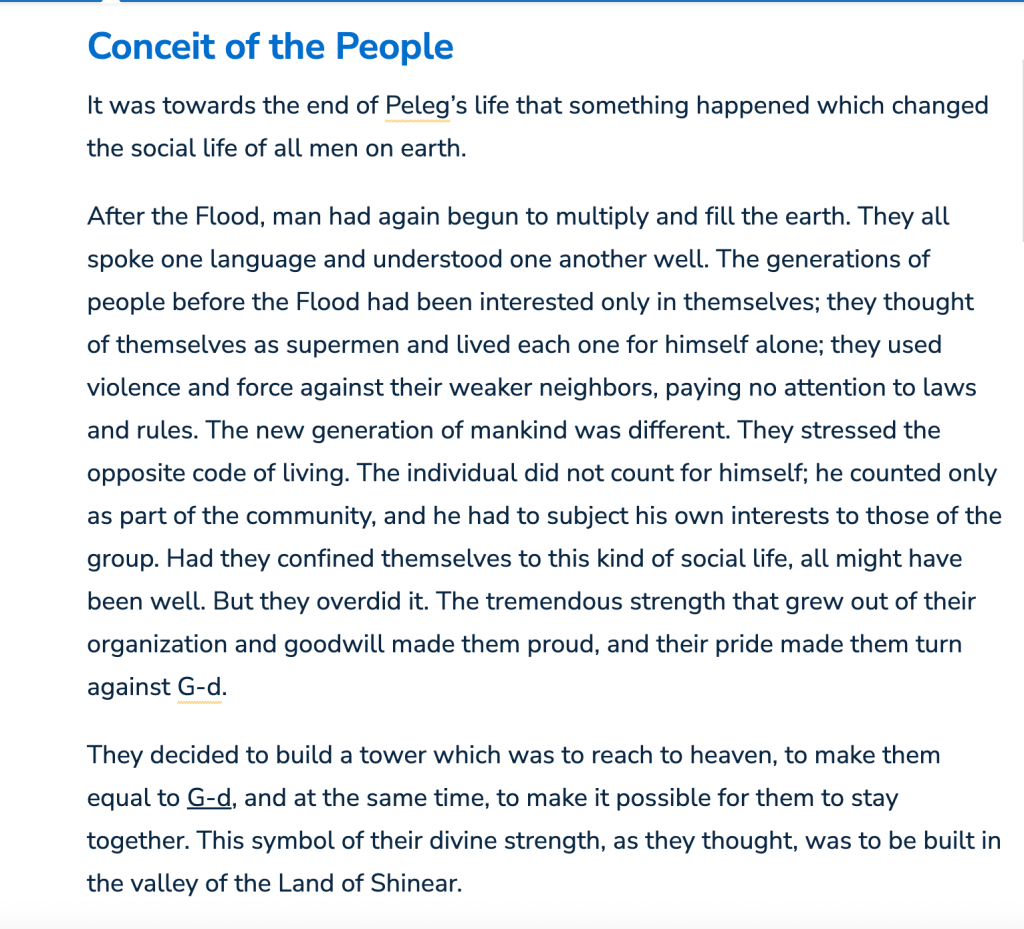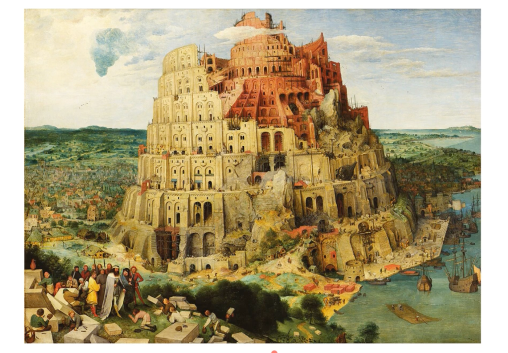 The image shows the painting The Tower of Babel by Pieter Bruegel the Elder. The painting depicts the biblical story from the Book of Genesis, in which humanity, unified by a single language, attempts to build a tower to reach heaven.