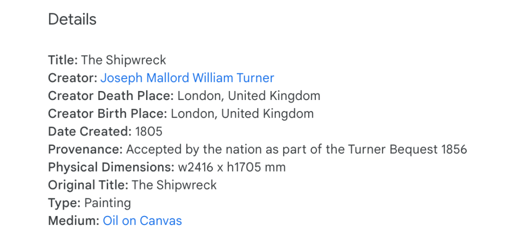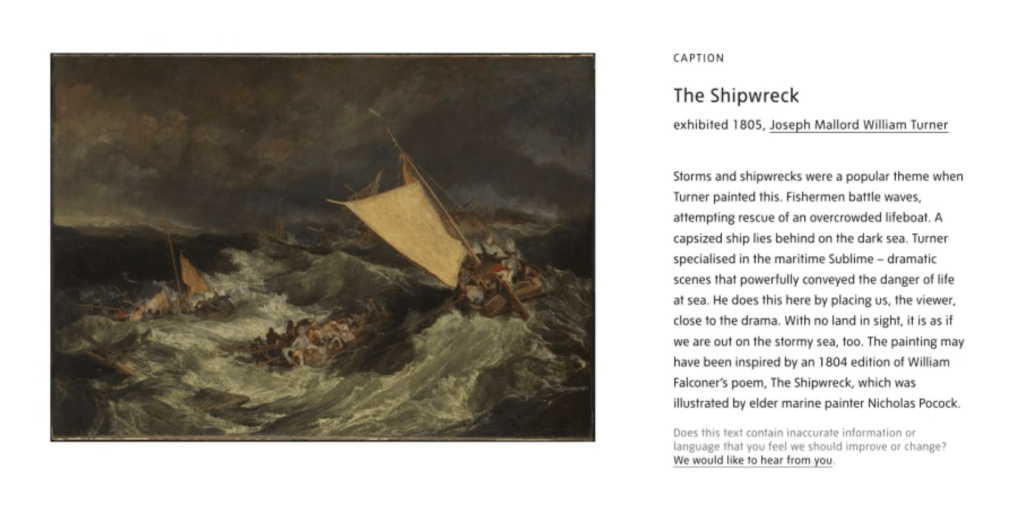 “Shipwrecks and other disasters at sea were a recurrent theme in Romantic painting. They demonstrated the primal force of the elements, a nightmare for all who travelled far from home. Turner retained a lifelong passion for the sea.